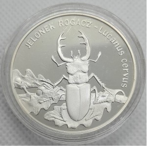 Na rewersie monety został umieszczony wizerunek chrząszcza Jelonka Rogacza na stylizowanej gałązce dębowej, w górnej części monety przy jej rancie półkolem napis: JELONEK ROGACZ - Lucanus cervus