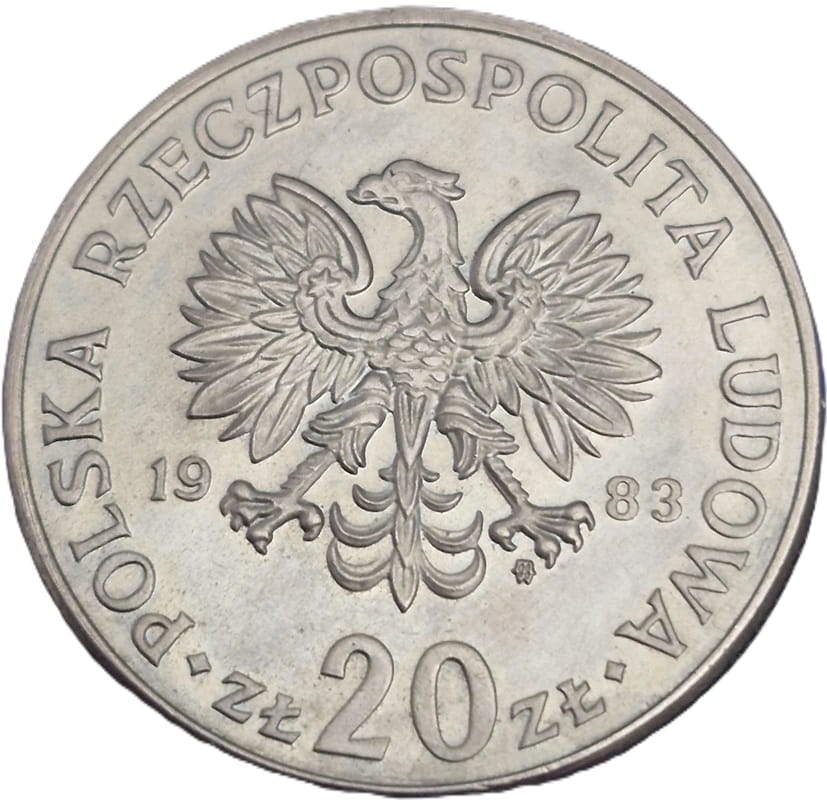 Na awersie orzeł bez korony ustanowiony dla godła Polskiej Rzeczypospolitej Ludowej. W otoku monety przy jej rancie napis: Polska Rzeczpospolita Ludowa oddzielony "koralikami" od nominału monety w zapisie zł 20 zł. Przy łapach orła po zewnętrznej stronie rozdzielony rok emisji monety 19-83 r. Między pazurami orła znak mennicy: m/w
