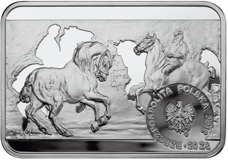 Na awersie monety w prawym dolnym rogu wizerunek orła w koronie, godło ustalone dla Rzeczpospolitej Polskiej. W otoku napis dużymi literami Rzeczpospolita Polska rok emisji 2012 oraz nominał monety 20 złotych. Z lewej strony monety stylizowany obraz pt. "Stajenni z koniem i psem". Pod lewą łapą orła znak mennicy: m/w