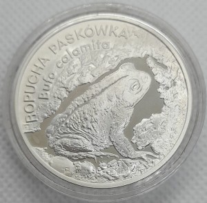 20 zł Ropucha paskówka 1998 r. - Srebrna moneta kolekcjonerska NBP z serii Zwierzęta Świata, numer 5 z 22 w serii. Moneta w kapslu ochronnym