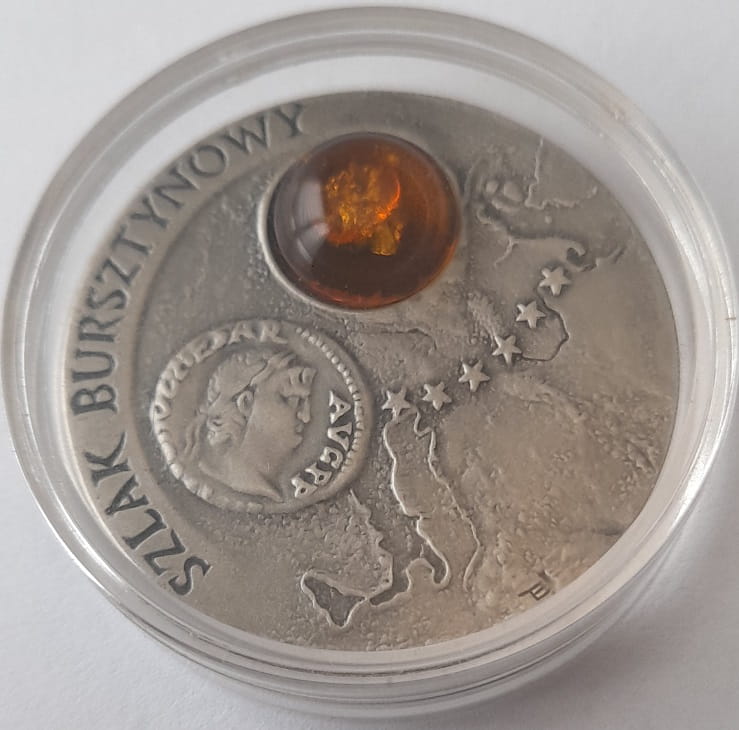 20 zł Szlak bursztynowy 2001 r. - Srebrna moneta kolekcjonerska NBP - Narodowy Bank Polski z bursztynem, oksydowana. Moneta w kapslu ochronnym.