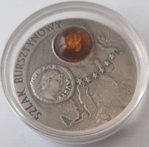 Na rewersie monety stylizowana mapa Europy na której za pomocą gwiazdek został zaznaczony dawny szlak bursztynowy. W górnej części monety został wtopiony bursztyn, poniżej wzór denara z Neronem. Z lewej strony monety półkolem napis dużymi literami: Szlak bursztynowy