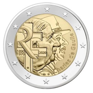 Na pierścieniu monety gwiazdki. Na rdzeniu monety na grafice stylizowane dwie twarz de Gaulla z prawego profilu. Pierwsza w głębi de Gaulla jako żołnierza, druga jako polityka. Od dołu monety ku górze po prawej stronie dużymi literami napis: Charles de Gaulle. Po lewej stronie wychodząca z pierścienia duża litera R. U jej nogi rok emisji 2020, a przy drugiej daty życia 1890 - 1970
