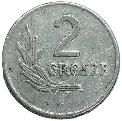 2 grosze 1949 r. - moneta obiegowa z okresu II Rzeczpospolitej Polskiej, metal aluminium, emitent Bank Polski, stempel zwykły, stan zachowania: moneta z obiegu, zdjęcie przykładowe prezentacyjne