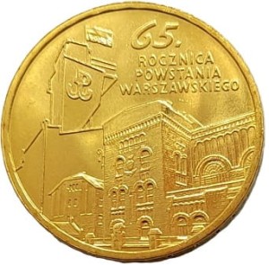 Moneta upamiętnia 65 rocznicę wybuchu Powstania Warszawskiego, które miało miejsce w czasie od 1 sierpnia do 3 październik 1944 r. Po obu stronach walczyło 50 tysięcy żołnierzy, jednak po stronie polskiej znacznie słabiej uzbrojonych.