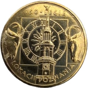 2 złote 750-lecie lokacji Poznania - moneta okolicznościowa 2 złote NG Nordic Gold NBP, producenta Mennica Polska S.A., temat indywidualny, stempel zwykły, stan zachowania 1/-1