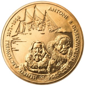 U dołu stylizowane wizerunki Henryka Arctowskiego i Antoniego Dobrowolskiego w zimowych ubraniach. W tle statek na pełnym morzu. W otoku monety napisy dużymi literami po lewej stronie od dołu w górę: Henryk Arctowski 1871-1958, po prawej stronie od góry w dół napis Antoni B. Dobrowolski 1872-1954