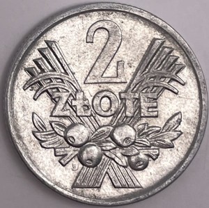 2 złotych Jagody 1970 r. - obiegowa moneta 2 złote Jagody PRL - Polsk Rzeczpospolita Ludowa, producent Mennica Polska S.A., aluminium, stempel zwykły, moneta w kapslu ochronnym, stan zachowania -2/+3, real foto