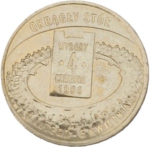 Na rewersie stylizowany wizerunek fragmentu sali obrad Okrągłego Stołu oraz stylizowane wizerunki znajdującym się na niej osób siedzących przy owym stole. Na środku monety stylizowana kartka z kalendarze. U góry monety przy jej rancie łukiem napis dużymi literami: Okrągły Stół. U dołu monety przy jej rancie daty: 6 lutego - 5 kwietnia