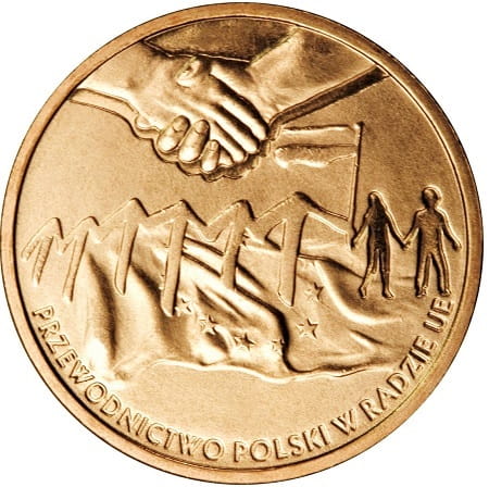 Na rewersie w jej centrum stylizowane logo Przewodnictwa Polski w Radzie Unii Europejskiej, na tle stylizowanego fragmentu flagi unii europejskiej. Z prawej strony monety na środku przy rancie stylizowane wizerunki dwóch osób trzymających się za rękę. W górnej części monety przy rancie stylizowane dwie ręce w uścisku dłoni. U dołu monety półkolem przy jej rancie napisy: PRZEWODNICTWO POLSKI W RADZIE UE