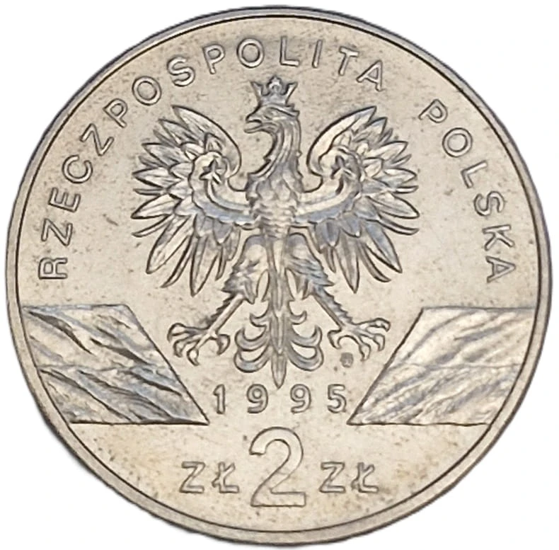 Na awersie orzeł w koronie ustanowiony dla godła Rzeczypospolitej Polskiej. Pod orłem rok emisji monety: 1995, poniżej przy dolnym rancie nominał monety w zapisie: ZŁ 2 ZŁ. Po bokach łap orła po prawej i lewej stronie stylizowane wizerunki flagi państwowej. U góry przy rancie monety półkolem napis dużymi literami od lewej do prawej strony: Rzeczpospolita Polska. Pod lewą łapą orła znak mennicy m/w