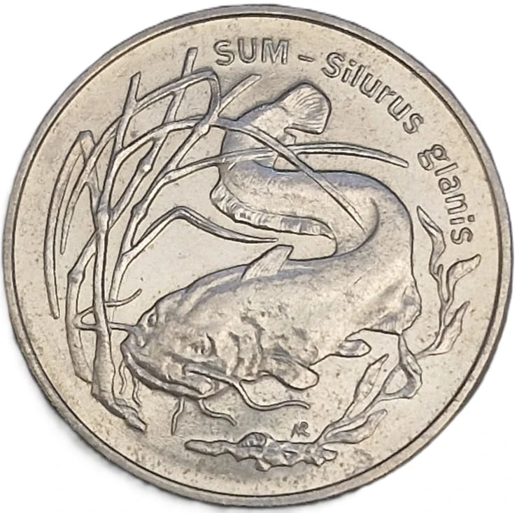Sum łac. Silurus glanis, moneta okolicznościowa miedzionikiel z kategorii monety 2 złote emitent NBP, producent Mennica Polska S.A., z serii Zwierzęta Świata, 2 z serii 20 monet, stempel zwykły, stop miedzionikiel. Średnica monety 29,50 mm, masa 10,80 gram, nakład emisji 300 000 sztuk, rok emisji 1995, projektant Roussanka Nowakowska, moneta w kapslu ochronnym, stan zachowania menniczy