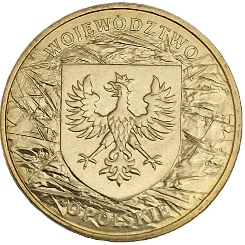 2 zł Województwo Opolskie 2004 r. - Moneta okolicznościowa NBP - Narodowy Bank Polski z serii Herby Województw Nordic Gold. Moneta w woreczku strunowym. Seria składa się z szesnastu monet, a województwo opolskie jest ósmą monetą z serii.