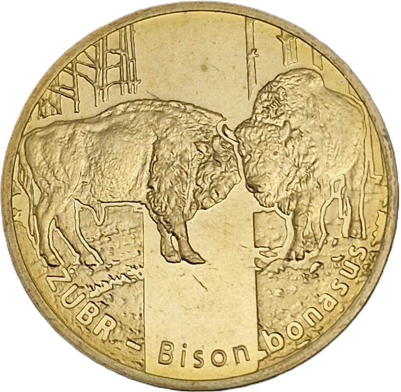 Na rewersie centralnej części monety – wizerunki dwóch żubrów w otoczeniu naturalnym, oddzielone dekoracyjną powierzchnią lustrzaną. W dolnej części monety, wzdłuż otoku – nazwa zwierzęcia w języku polskim i łacińskim (ŻUBR – Bison bonasus)