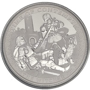 U góry monety dużymi literami napisy: TIME OF CONTEMPT (tłumaczenie: czas pogardy), u dołu zaś THE WITCHER (tłumaczenie: Wiedźmin) oraz w dwóch rzędach napisy: BOOK SERIES (seria książek). Wokół ornamenty przy rancie monety, a między napisami. Na grafice zilustrowana jedna ze scen opisana części poświęconej tej moncie