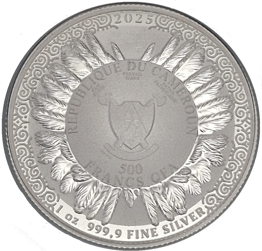 W centralnej części monety okrąg a na nim godło państwa Kamerun. Pod godłem u dołu widnieje próba Ag999. Poniżej godła nominał 500, a pod nim słownie dużymi literami Francs CFA. W około okręgu gałązki drzewa iglastego. U góry monety przy jej rancie rok emisji 2025. U dołu monety także przy jej rancie oznaczenia i napisy: 1oz 999,9 FINE SILVER. Wokół ornamenty przy rancie monety.