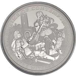 U góry monety dużymi literami napisy: TIME OF CONTEMPT (tłumaczenie: czas pogardy), u dołu zaś THE WITCHER (tłumaczenie: Wiedźmin) oraz w dwóch rzędach napisy: BOOK SERIES (seria książek). Wokół ornamenty przy rancie monety, a między napisami. Na grafice zilustrowana jedna ze scen opisana części poświęconej tej moncie
