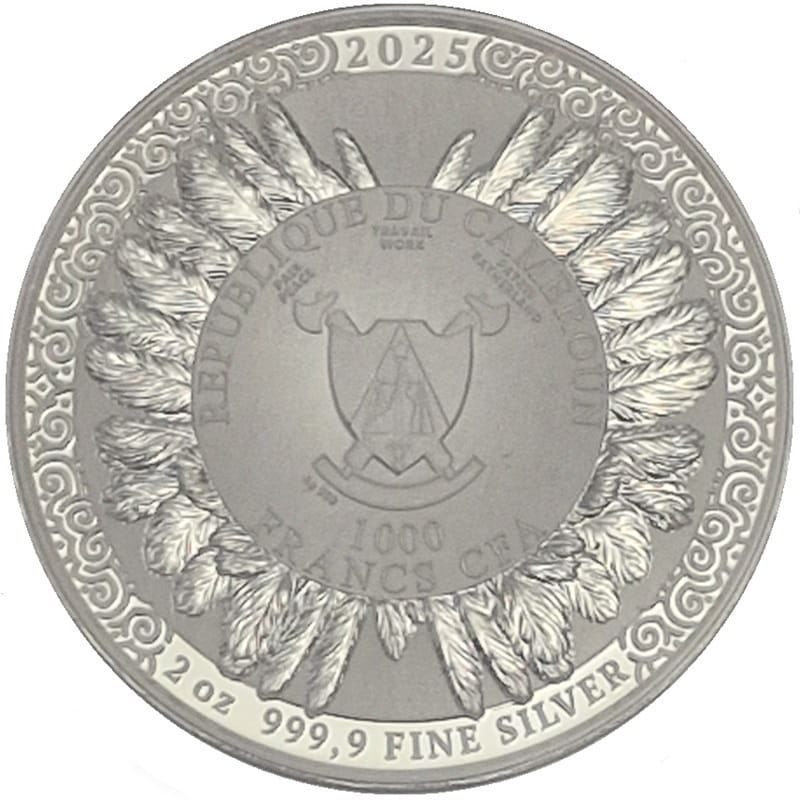 W centralnej części monety okrąg a na nim godło państwa Kamerun. Pod godłem u dołu widnieje próba Ag999. Poniżej godła nominał 1000, a pod nim słownie dużymi literami Francs CFA. W około okręgu gałązki drzewa iglastego. U góry monety przy jej rancie rok emisji 2025. U dołu monety także przy jej rancie oznaczenia i napisy: 2oz 999,9 FINE SILVER. Wokół ornamenty przy rancie monety.