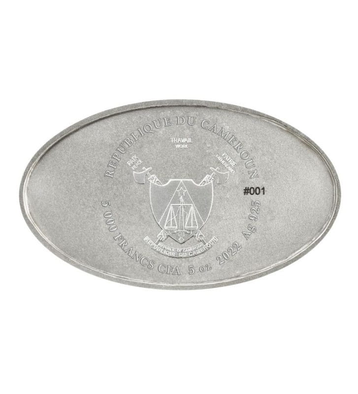 Awersem jest spód monety gdzie jest godło państwa emitenta, U góry napisy: Republique du Cameroun, numer monety, dalej próba oraz rok emisji 2022, nominał monety oraz masa 5 unicji