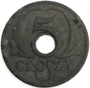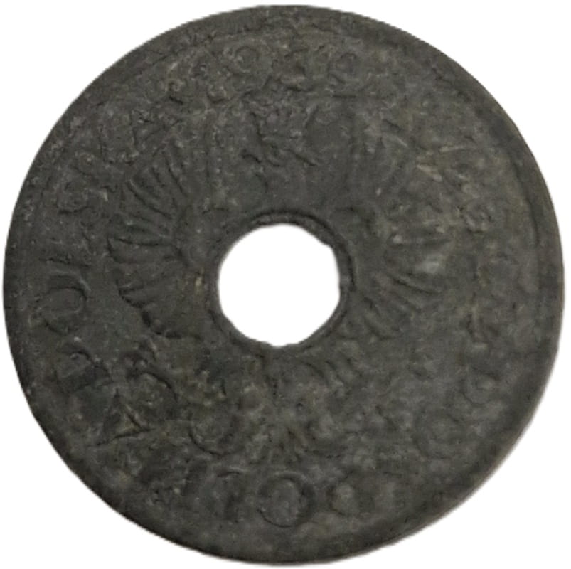Moneta obiegowa na utworzonym na ziemiach polskich Generalnym Gubernatorstwie. Moneta bita zwykłym stemplem z otworem w środku, metal cynk, stan zachowania 3, real foto