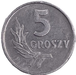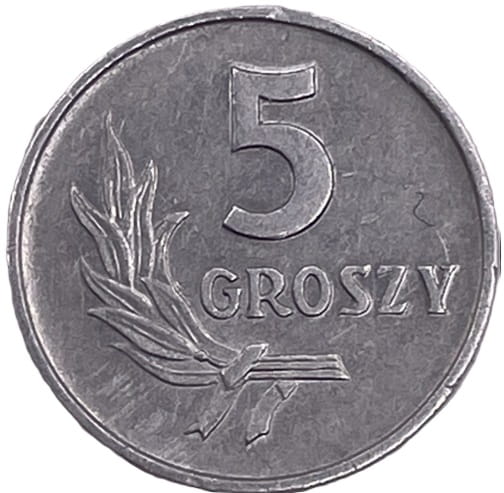 5 groszy 1958 r. bez znaku mennicy - moneta obiegowa z okresu II Rzeczpospolitej Polskiej, metal aluminium, emitent Bank Polski, stempel zwykły, stan zachowania: z obiegu, zdjęcie przykładowe, prezentacyjne