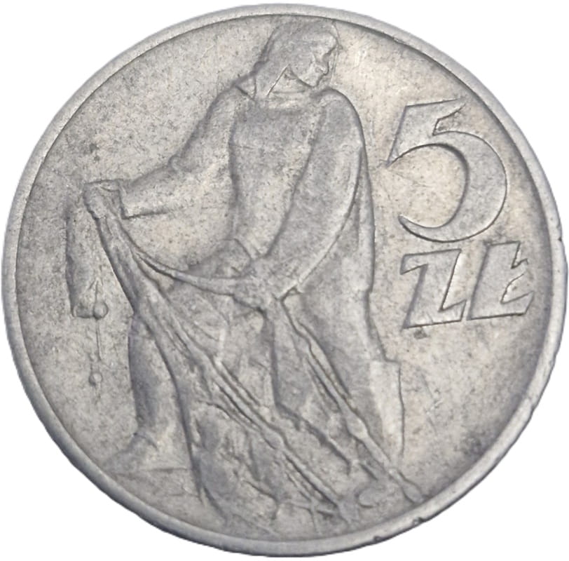 Moneta 5 złotych Rybak 1959 r. - Moneta obiegowa z okresu PRL (Polska Rzeczpospolita Ludowa) ze stopu aluminium. Moneta w woreczku strunowym.