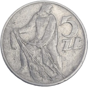 5 złotych Rybak 1959 r. b.z. - moneta obiegowa PRL, producent Mennica Polska S.A., aluminium, stempel zwykły, stan zachowania około 3/-3, real foto