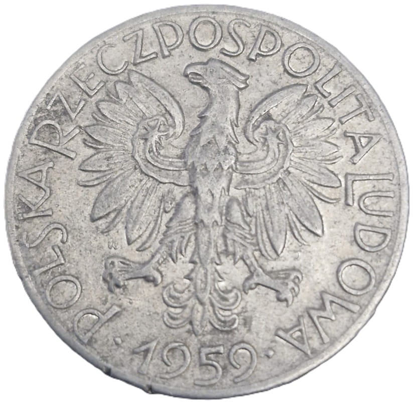 Na awersie w centrum widnieje orzeł bez korony ustanowiony dla godła Polskiej Rzeczpospolitej Ludowej. W otoku monety przy jej rancie napis dużymi literami: Polska Rzeczpospolita Ludowa oraz rok emisji monety 1959 na dole przy rancie oddzielony od napisu na początku i na końcu rąbami. Pod lewą łapą orła znak mennicy: m/w. Nad prawą łapą orła znak W, nad lewą łapą znak J