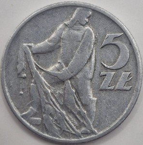 Moneta 5 złotych Rybak 1960 r. - Moneta obiegowa z okresu PRL (Polska Rzeczpospolita Ludowa) ze stopu aluminium. Moneta w woreczku strunowym.