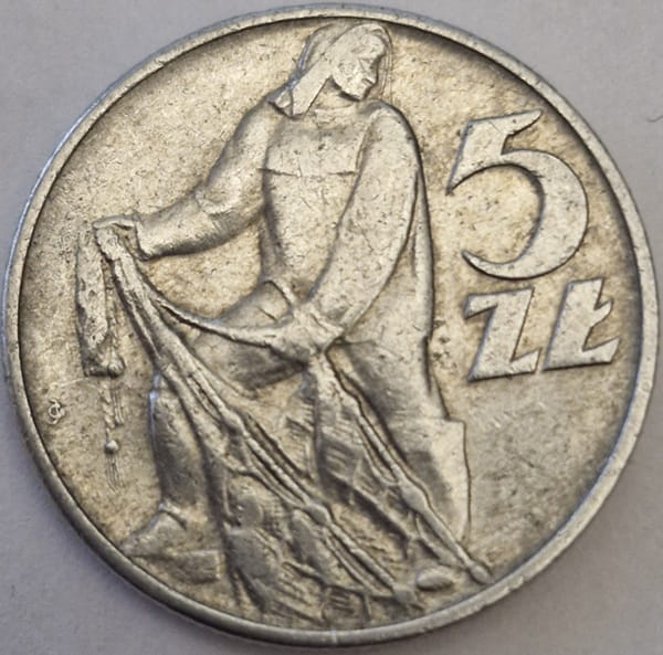 Moneta 5 złotych Rybak 1973 r. - Moneta obiegowa z okresu PRL (Polska Rzeczpospolita Ludowa) ze stopu aluminium. Moneta w woreczku strunowym.