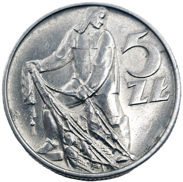 5 złotych Rybak 1974 r. - moneta obiegowa PRL, producent Mennica Polska S.A., aluminium, stempel zwykły, stan zachowania około menniczy +2/-1