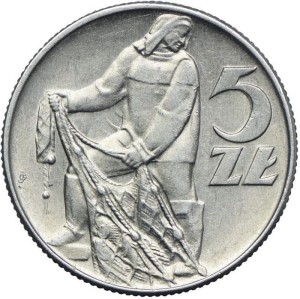 5 zł Rybak 1974 r. - obiegowa moneta PRL, producent Mennica Polska S.A., aluminium, stempel zwykły, wersja tzw. Słoneczko, promienie pod górną ręką rybaka.