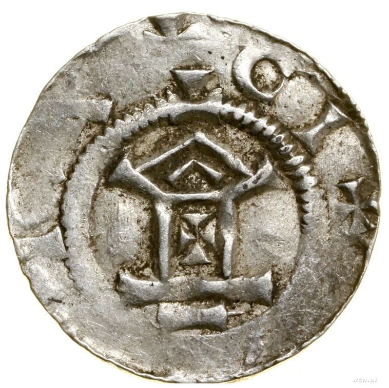 Niemcy - Frankonia - Moguncja – arcybiskupstwo - Otto II (973–983), denar, Aw: Krzyż, w każdym kącie kulka, …TO + GV…, Rw: Kapliczka z krzyżem wewnątrz, CI + …A