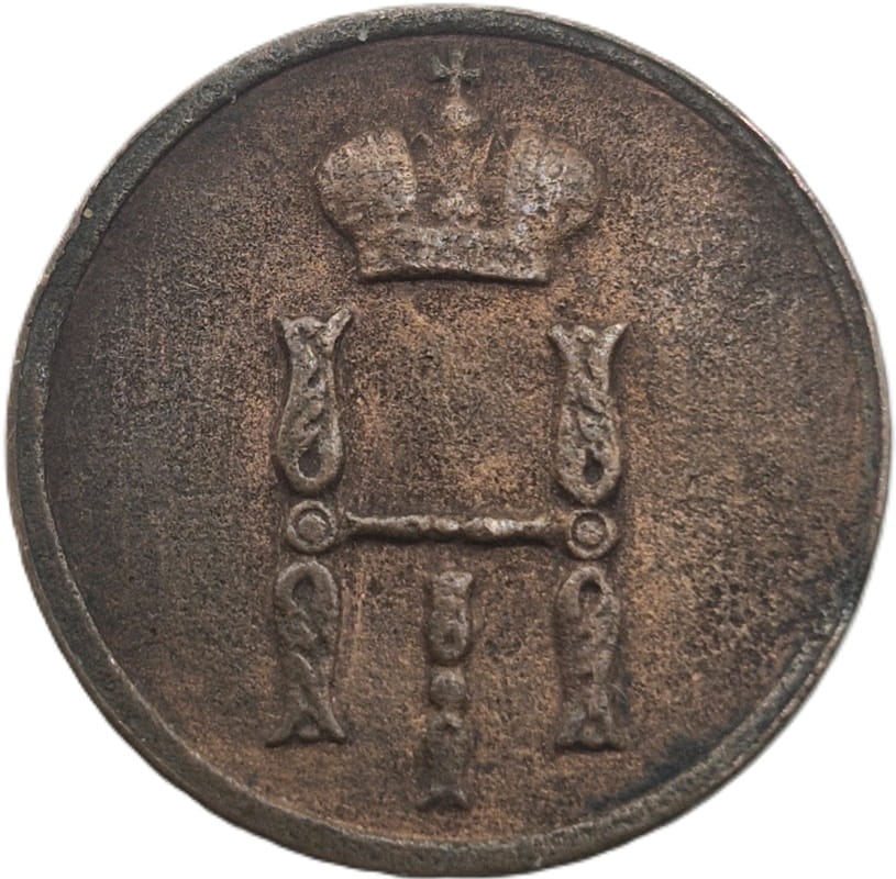 Monet wybita w Mennicy Warszawskiej, stempel zwykły, nominał 1/2 kopiejki, średnica 18 mm, metal miedź, rok emisji 1853, wielkość emisji 804 396 sztuk, stan zachowania ok. 3