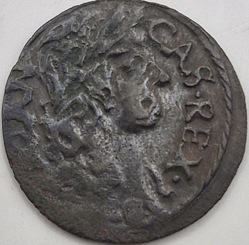 Wizerunek Jana Kazimierz z prawego profilu. Obok głowy króla od góry dużymi literami napis: CAS. REX.