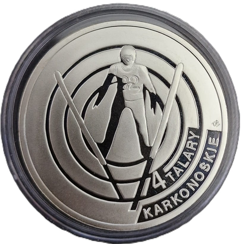 W centralnej części monety skoczek narciarski w locie z ułożonymi nartami w literę V. Na zewnątrz powiększające się okręgi. U dołu po prawej stronie w dwóch rzędach napisy: 4 talary / karkonoskie oraz monogram projektanta monety