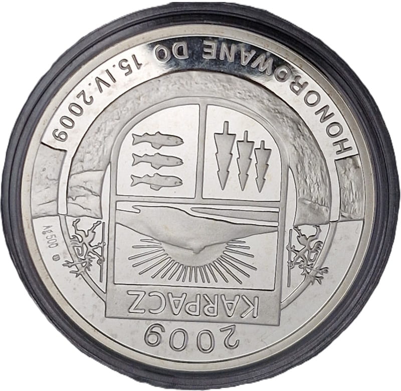 4 Talary karkonoskie Karpacz 2009 r. - moneta zastępcza, producent Mennica Polska S.A., stemple lustrzany, metal / stop srebrna moneta Ag500, nakład zaledwie 500 szt., średnica 38,61 mm, masa 20 gram, moneta w kapslu ochronnym, stan zachowania L/L