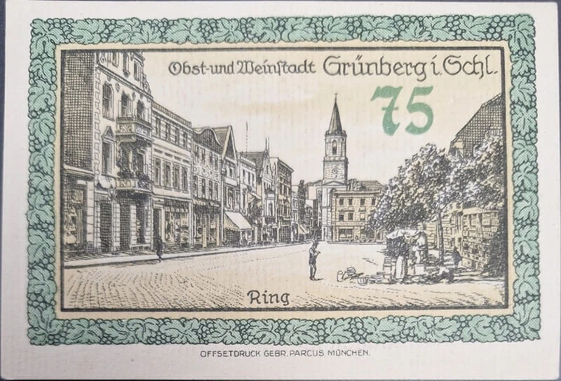 Notgeld Zielona Góra (Grünberg in Schlesien) 75 pfenningów 1921 – Rynek to banknot zastępczy emitowany na terenach dzisiejszej Polski w okresie powojennego kryzysu gospodarczego. Pochodzi z miasta Zielona Góra (niem. Grünberg in Schlesien) i stanowi interesującą pozycję dla kolekcjonerów notgeldów oraz banknotów regionalnych.