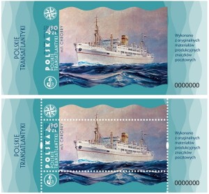Po lewej stronie w dwóch rzędach dużymi literami pionowo napisy: Polskie transatlantyki. Po prawej stronie w kilku rzędach napis: Wykonano z oryginalnych materiałów produkcyjnych znaczków pocztowych. Poniżej czarną czcionką numer nowodruków. U góry znak tzw. róża wiatrów, a u dołu kotwica.