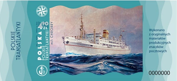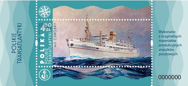 Na grafice znaczków polski transatlantyk Chrobry na pełnym morzu. Po lewej stronie na wyodrębnionym polu pionowo dużymi literami białą czcionką napis: Polska. Obok w dwóch rzędach również pionowo napisy: Polskie transatlantyki. Powyżej nominał 4,90 zł kasowany. Przy napisie Polska, także pionowo ale czarną bardzo małą czcionką napisy: Mal. A. Werka PWPW 2024