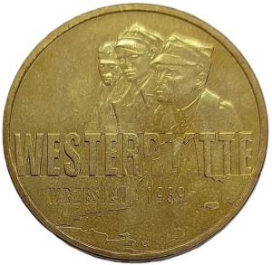 Na rewersie monety u góry, od lewej strony, stylizowane wizerunki: por. Stefana Grodeckiego, kpt. Mieczysława Słabego i kpt. Franciszka Dąbrowskiego. Centralnie napis: WESTERPLATTE/WRZESIEŃ 1939. Pod nim stylizowany kontur kłębów dymu unoszących się nad Westerplatt