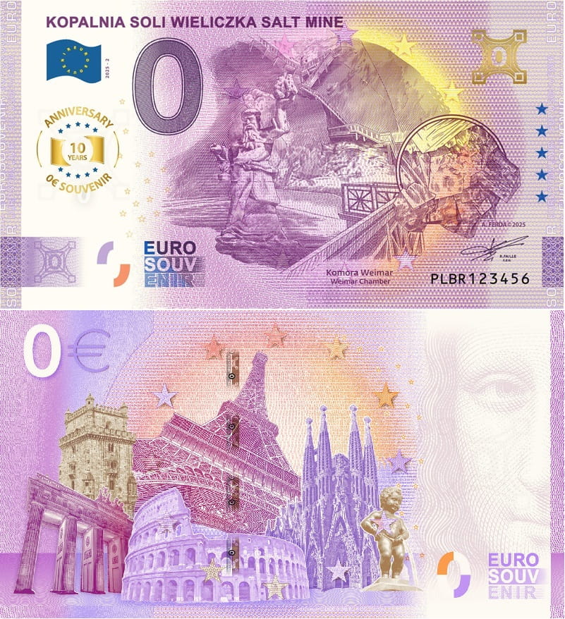0 euro Wieliczka 2025 - Banknot kolekcjonerski, pamiątkowy Polskie 0 euro.