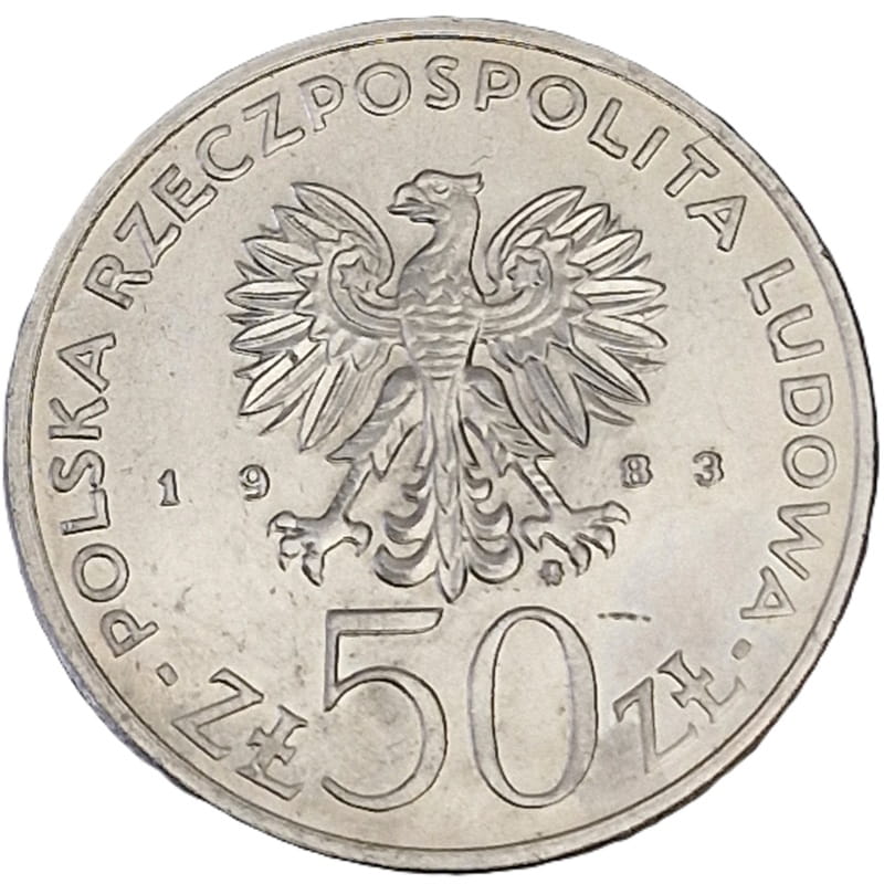 Na awersie w jej centralnym miejscu orzeł bez korony godło ustanowiony dla Rzeczpospolitej Polski Ludowej. Po bokach orła rok emisji monety 1983. W otoku monety przy jej rancie napis dużymi literami: POLSKA RZECZPOSPOLITA LUDOWA oraz nominał monety w zapisie ZŁ 50 ZŁ oddzielone od sobie po obu stronach koralikiem. Pod lewą łapą orła znak mennicy: m/w