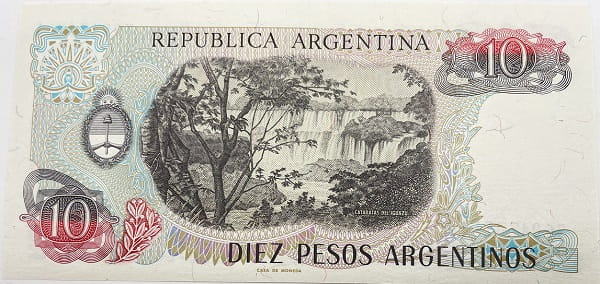 Stylizowany obraz z roślinnością i widokiem na wodospad Cataratas del Iguazu. W lewym dolnym rogu i prawym górnym wśród ornamentów nominał banknotu 10. U góry banknotu napis dużymi literami: Republica Argentina