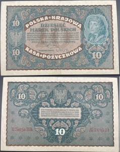 10 marek polskich 1919 - banknot obiegowy emitowany przez Polską Krajową Kasę Pożyczkową w Królestwie Polskim, emisja 23 sierpnia 1919 r., materiał papier, banknot w stanie +2, real foto