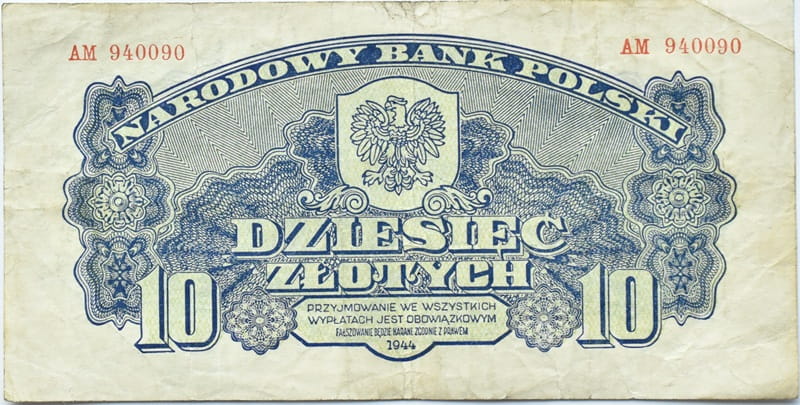 Na środku banknotu u góry orzeł bez korony na tarczy. Poniżej orła nominał 10 oraz poniżej dużymi literami: dziesięć złotych. U góry po prawej i lewej stronie czerwoną czcionką seria i jej numer. U dołu banknotu w środkowej części klauzula ze słowem "obowiązkowym". Pod klauzulą rok emisji banknotu 1944, wokół bogate zdobienia ornamentowe