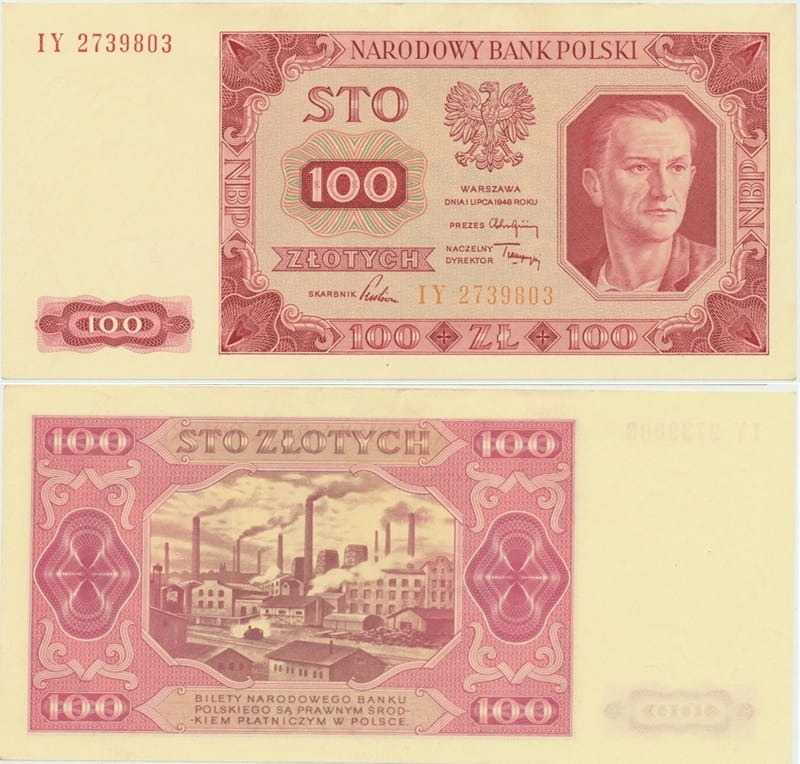 100 złotych 1948 r. - Banknot obiegowy PRL (Polska Rzeczpospolita Ludowa). Materiał - papier, emitent - Narodowy Bank Polski, producent - Państwowa Wytwórnia Papierów Wartościowych w Warszawie.