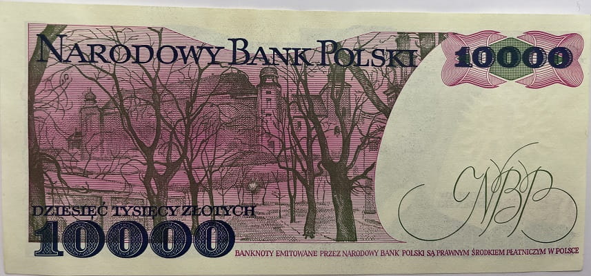 Na rewersie banknotu stylizowane Planty krakowskie z obrazu Wyspiańskiego "Planty o świcie". U góry banknotu napis: NARODOWY BANK POLSKI. W prawy górnym i w lewym dolnym rogu nominał banknotu 10000 zł. U dołu banknotu napis: BANKNOTY EMITOWANE PRZEZ BANK POLSKI SĄ PRAWNYM ŚRODKIEM PŁATNICZYM W POLSCE. Nad nim stylizowany napis NBP