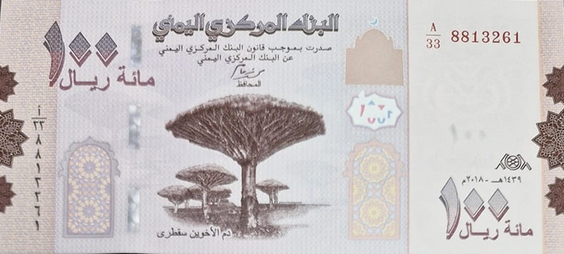 Banknot 100 rial Jemen 2018 rok - Banknot obiegowy w stanie UNC z serii banknoty świata kontynent Azja.