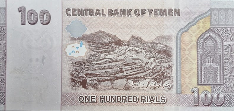 W lewym górnym rogu oraz w prawym dolnym nominał banknotu. U góry dużymi literami napisy: Central Bank of Yemen, a u dołu One Hundred rials